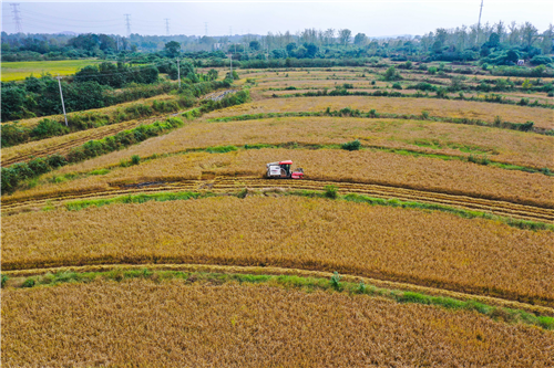 10月14日,信阳市光山县罗陈乡张楼村农民正在抢收水稻。 谢万柏 摄