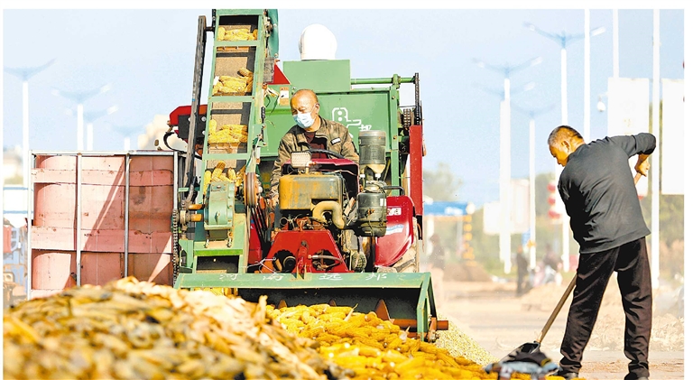 10月13日,在武陟县木栾街道小岩村,农民抢抓晴好天气进行玉米脱粒晾晒。 王琳锋 摄
