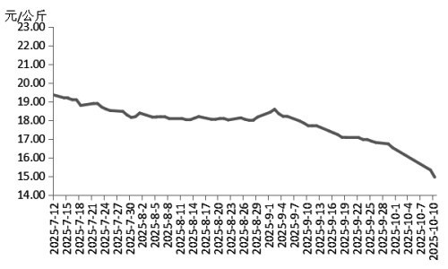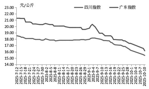 本周,四川地区猪肉周均价为每公斤15.49元,环比下跌5.2%,同比下跌35.0%,较上周跌幅扩大3.3个百分点。规模养殖场降价出栏,生猪及猪肉供应充足;国庆、中秋双节已过,持续阴雨天气抑制猪肉消费,屠宰企业订单量减少,猪肉价格下跌。