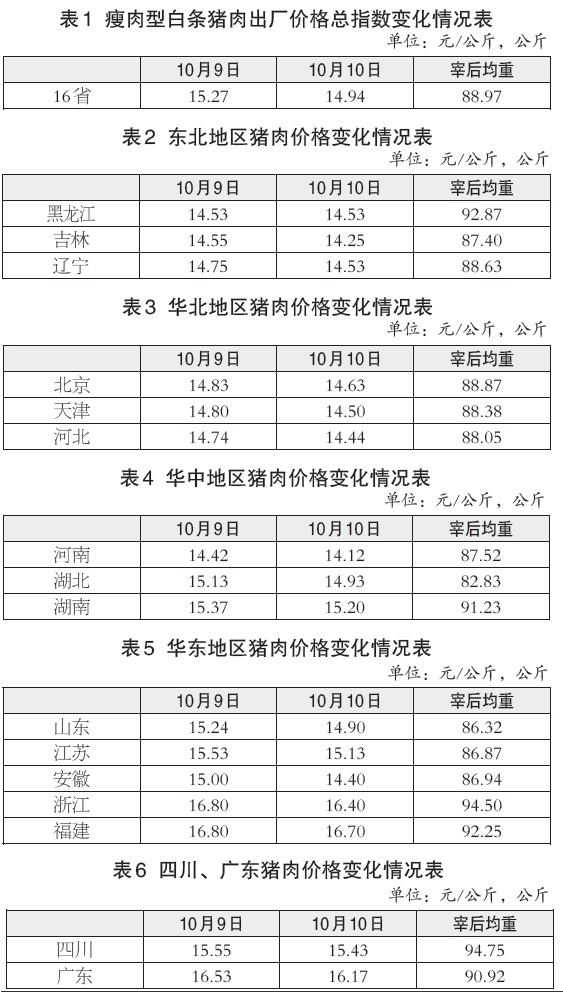 本周华东地区猪肉价格环比明显下跌。规模养殖场和散养户的生猪出栏量增加,生猪及猪肉供应充足;国庆、中秋双节过后猪肉需求低迷,屠宰企业订单量下滑,销售速度减缓,猪肉价格明显下跌。
