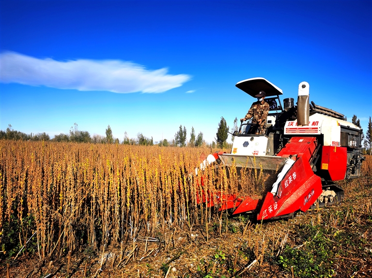 10月20日,商水县张庄镇的农田里,种植大户刘天华看着机器在地里轰鸣,不多时,一粒粒芝麻从出粮口哗啦啦流进三轮车里。